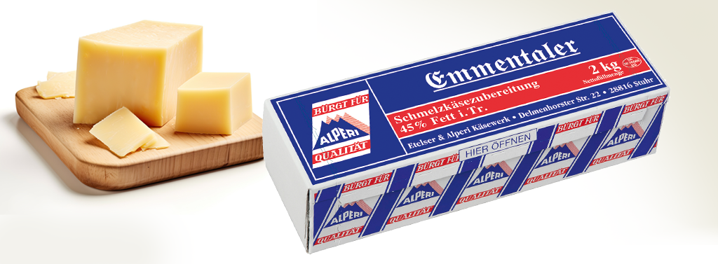 Käse in Spezialformaten für die weiterverarbeitende Industrie – Dabei können Sie wählen zwischen Schmelzkäse mit oder ohne Schmelzsalze und Naturkäse. Neben den verschiedenen Sorten können wir eine große Bandbreite von Formaten herstellen: